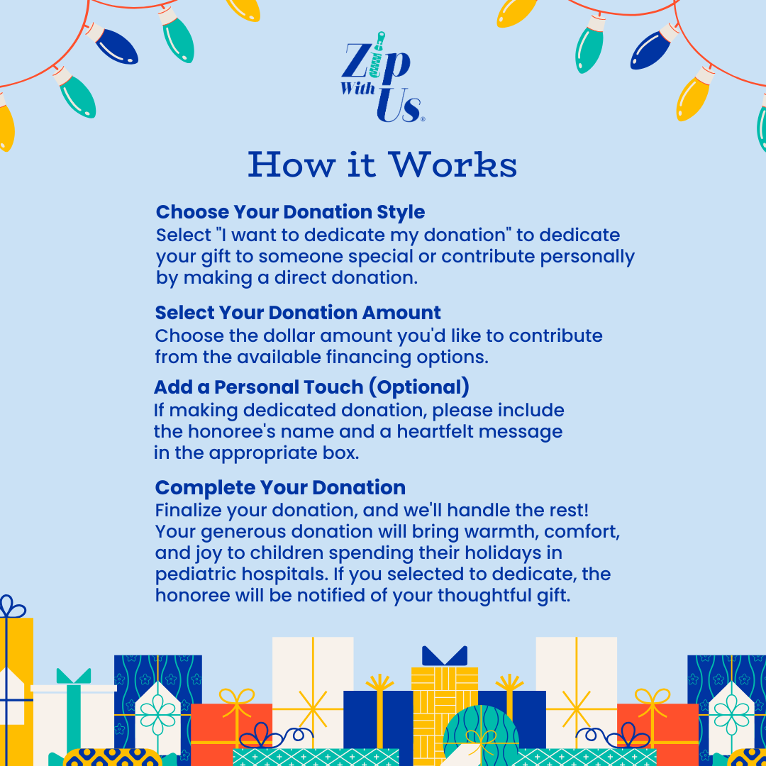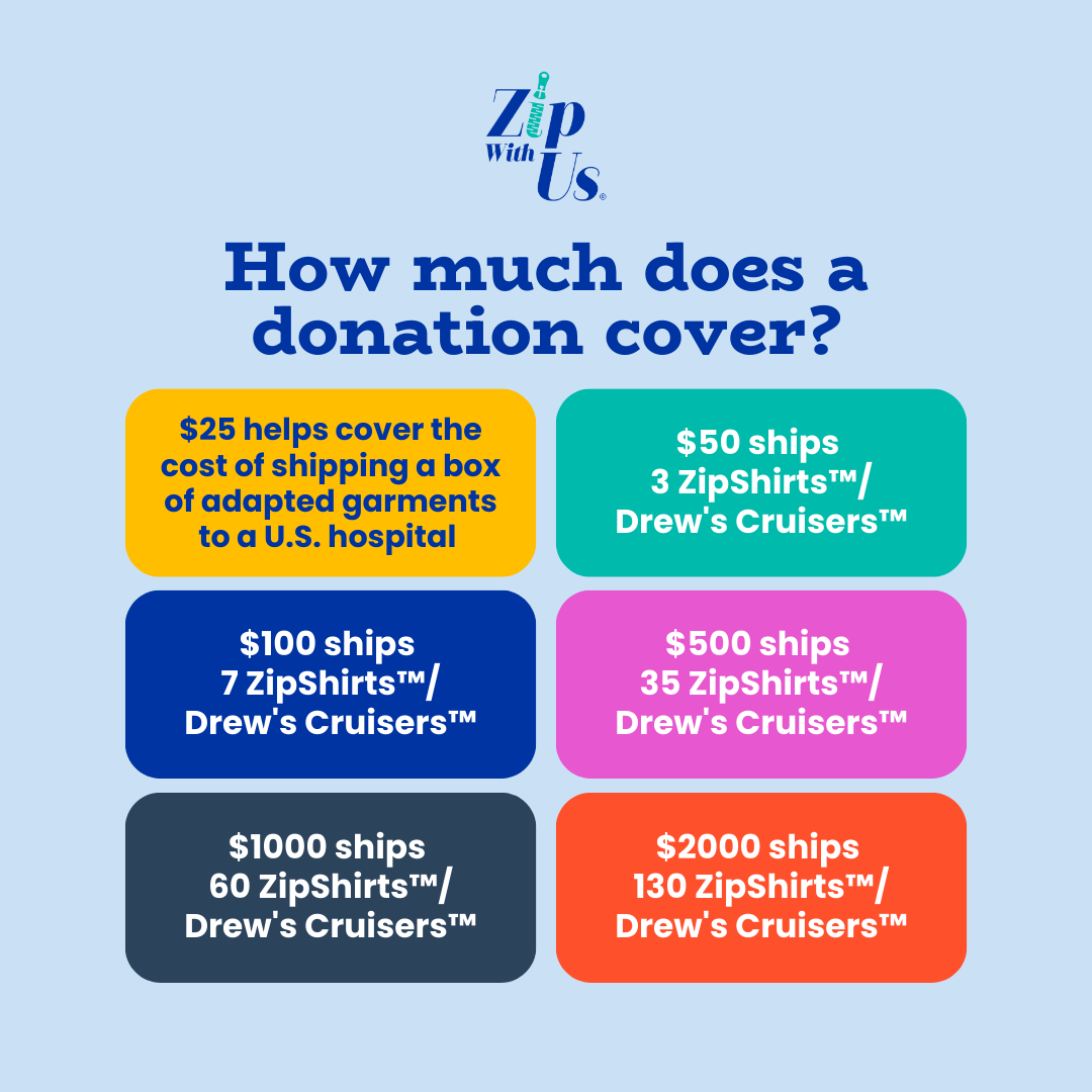 Your generous, tax-deductible donation provides custom ZipShirts™ and Drew's Cruisers™ onesies. These garments are specially designed to work seamlessly with implanted medical access devices so pediatric patients can receive life-saving medications and infusions in comfort. These personalized medical garments are distributed free of charge to more than 150 pediatric hospitals across the U.S., offering dignity, safety, and functionality to young patients undergoing challenging treatments.