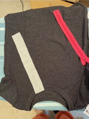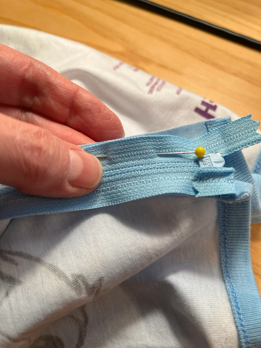 Holding the zipper in place, pin the zipper to the shirt starting about an inch below the neckline. This avoids an awkward pin at the neckline.