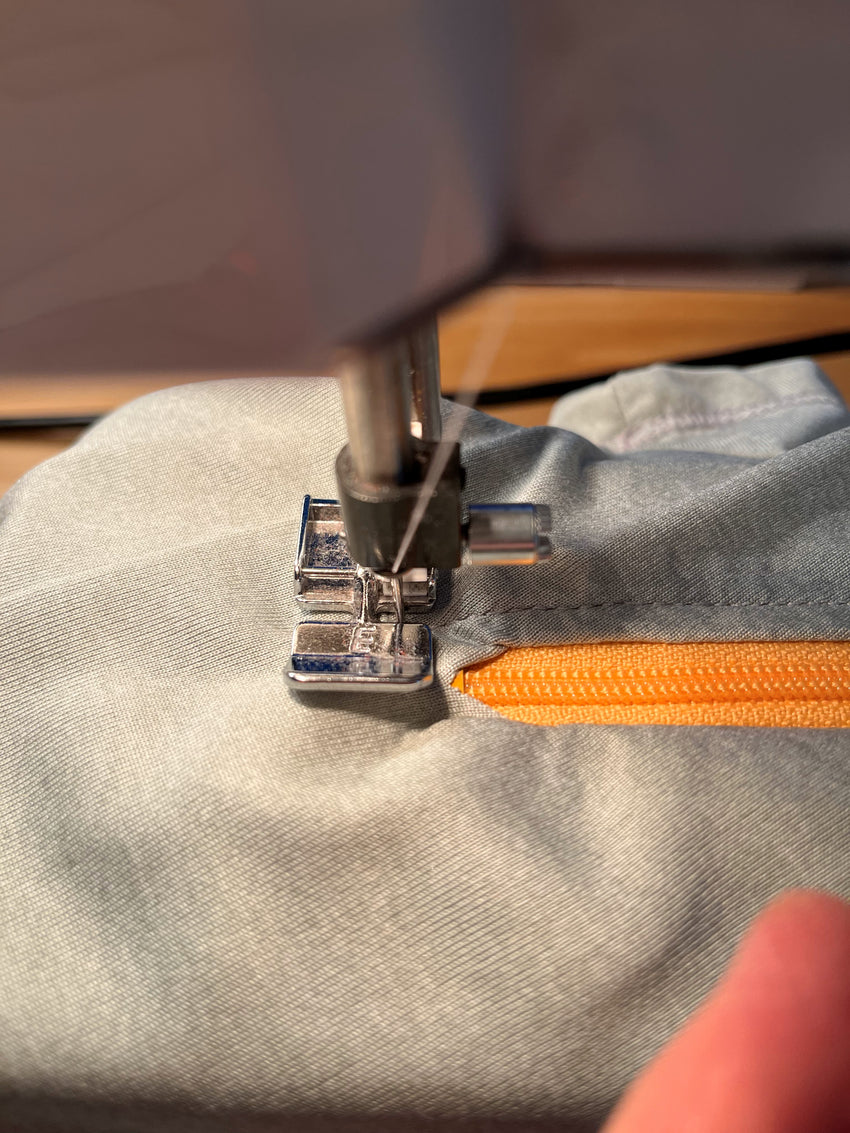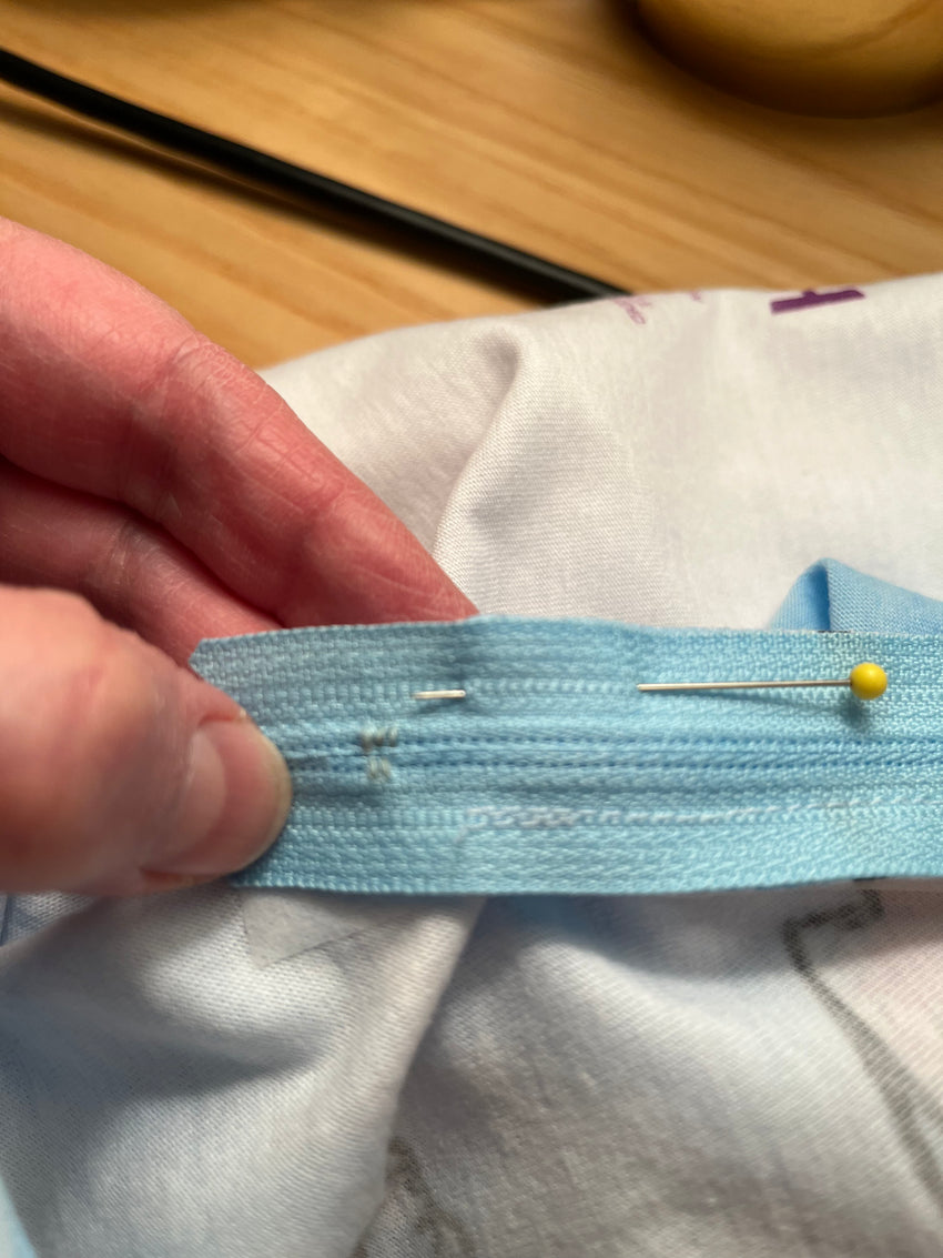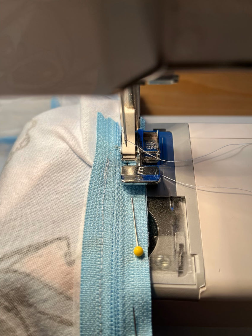 Stitch the pinned zipper in, starting at the bottom of the zipper, where the last pin exits, to match the other side, and opening the zipper half way through so it will lie flat at the end.