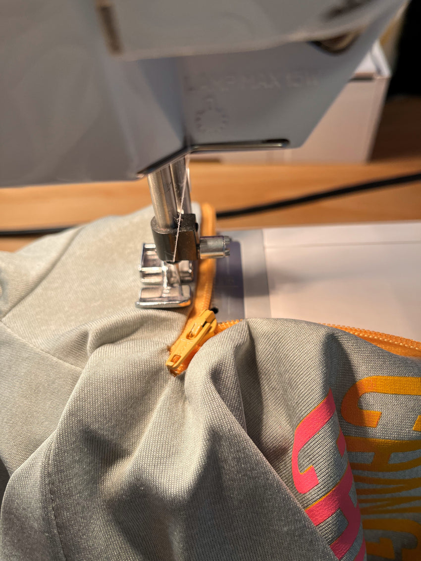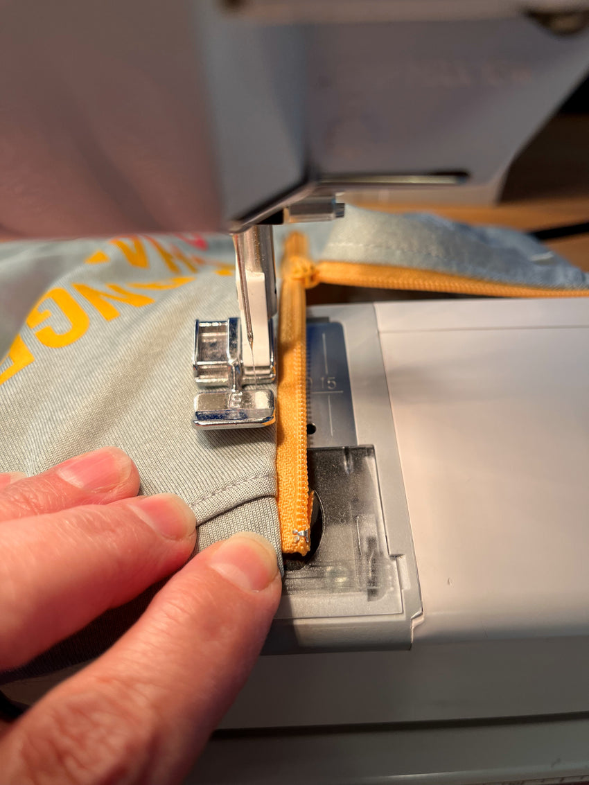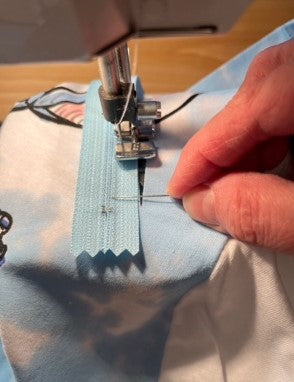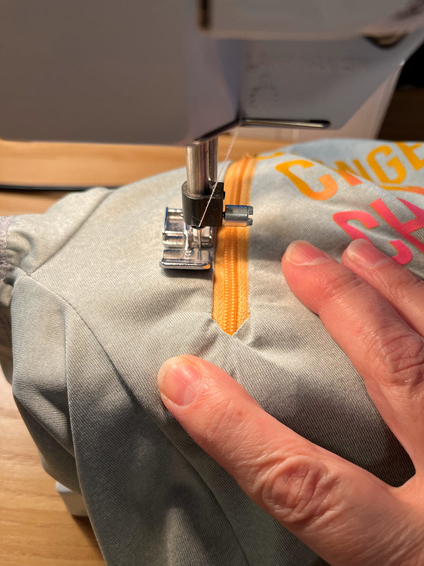Topstitch around the zipper using thread that matches the shirt or a complimentary color.