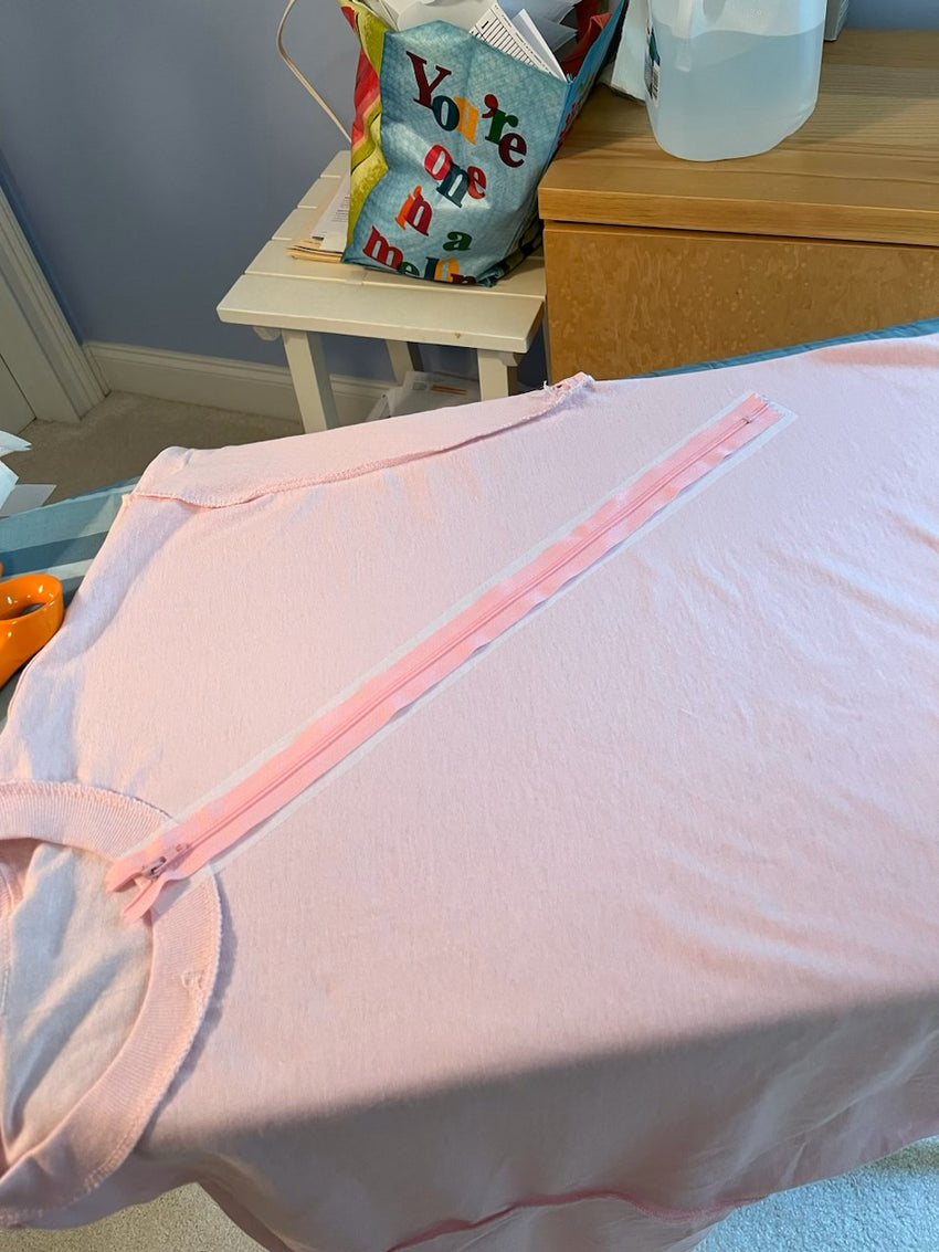 Pin the rest of the zipper to the shirt. At the end, pinch the shirt fabric and pull it out and up so you can pin it all the way down. Place your last pin so it comes out where the stitching ends on the other side.