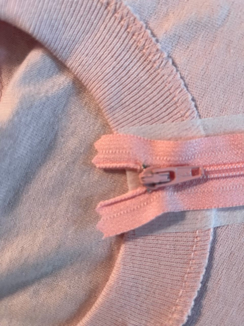 Open the zipper and pin it to the right side of the neckline opening, turning down the excess fabric at the top and placing the folded edge of the zipper about 1/8 inch from the edge of the neckline. The zipper right side will be facing the shirt right side and the folded part will be facing you.