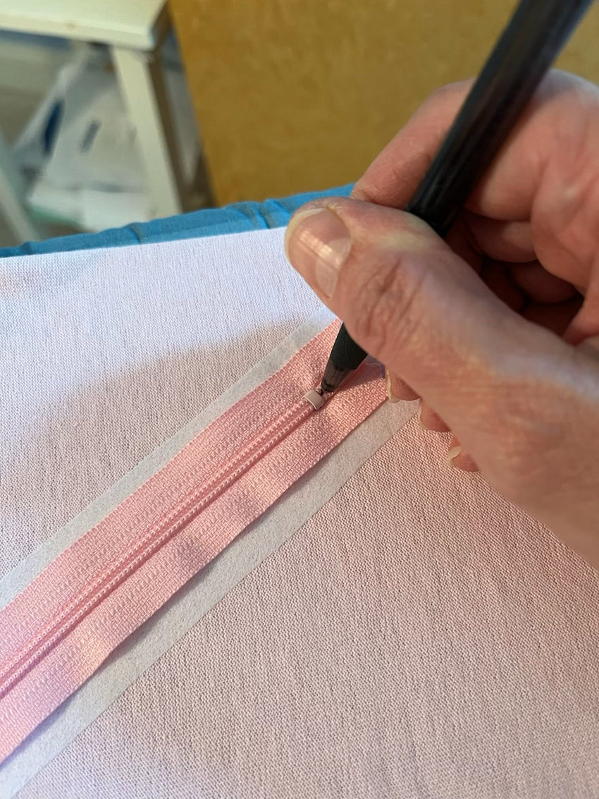 a mark with a pen at the bottom end of the zipper just below the metal zipper stop.