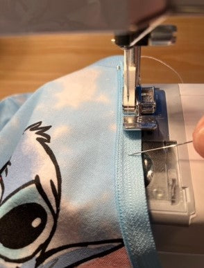 Stitch from the top down to 1/8 inch above the zipper stop, reversing the direction at the top and bottom to reinforce the stitching. Half way down, close the zipper to allow the zipper to lie flat at the bottom.