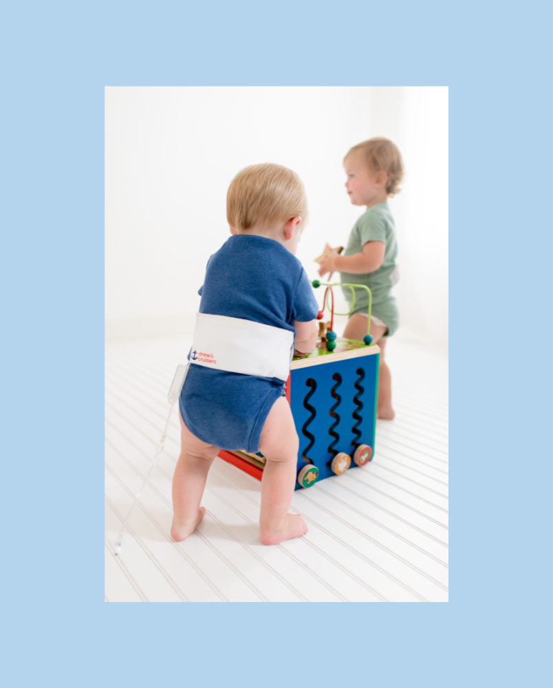 This onesie was designed to help protect central lines for babies, preventing the line from hanging out of the bottom of the onesie by keeping it securely wrapped around their backs and tucked away in a Velcro pocket. The side snaps allow the onesie to be changed with ease and without having to de-access lines while connected to IV tubing. Drew’s Cruisers™ adapted onesies strive to lower the risk of an unnecessary infection, accidental dislodgment or unneeded surgery, while keeping your sweet baby comfortable and mobile. For babies with Mediports/Portacaths, our ZipCruisers™ provide a zippered access to the port area in addition to the ingenious support of the original Drew's Cruisers™, including side snaps and a Velcro pocket to keep lines safely tucked away.