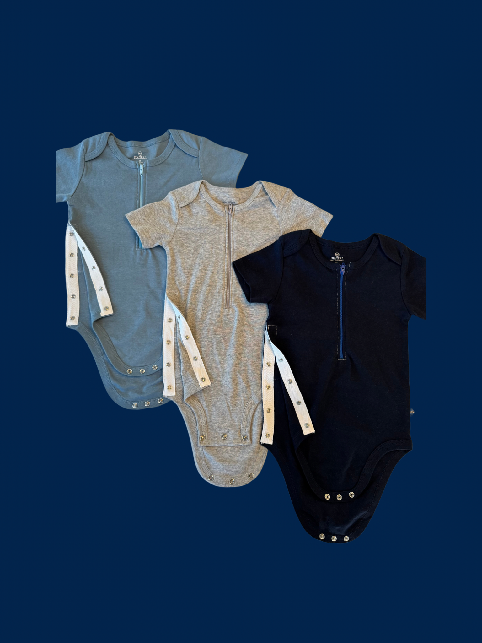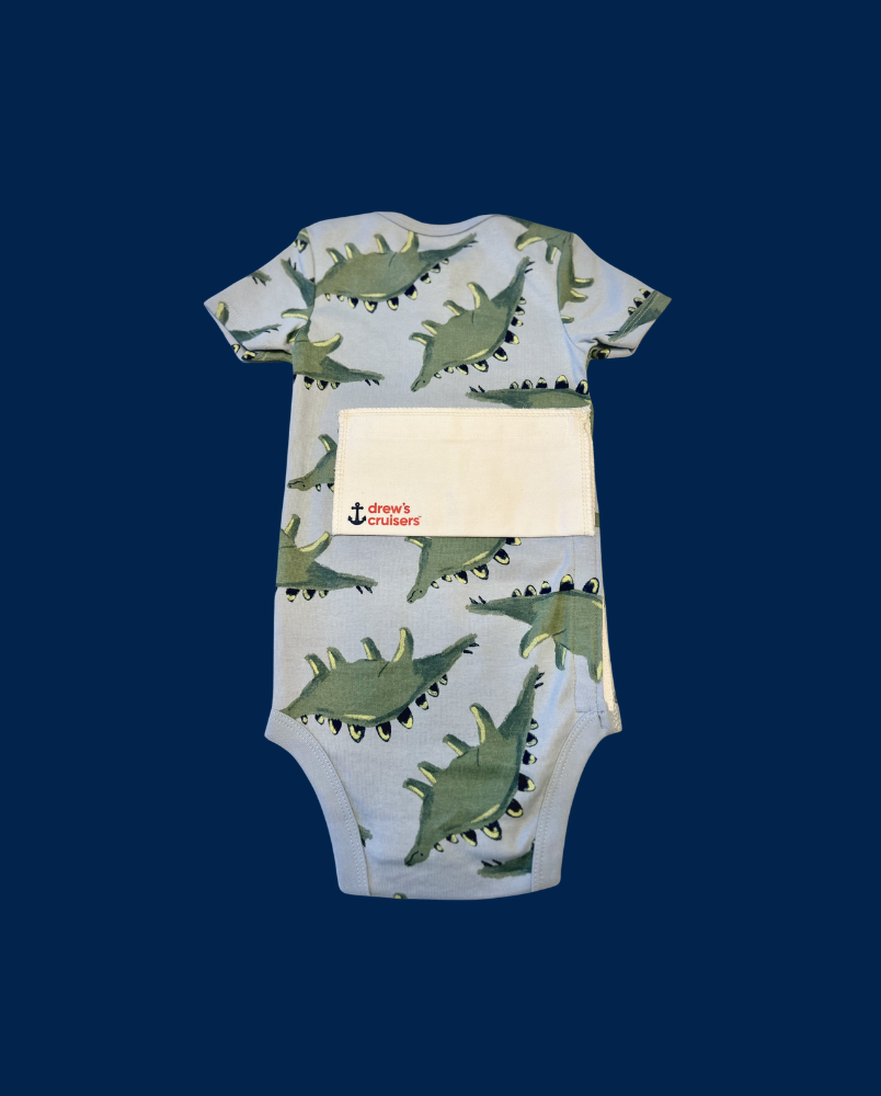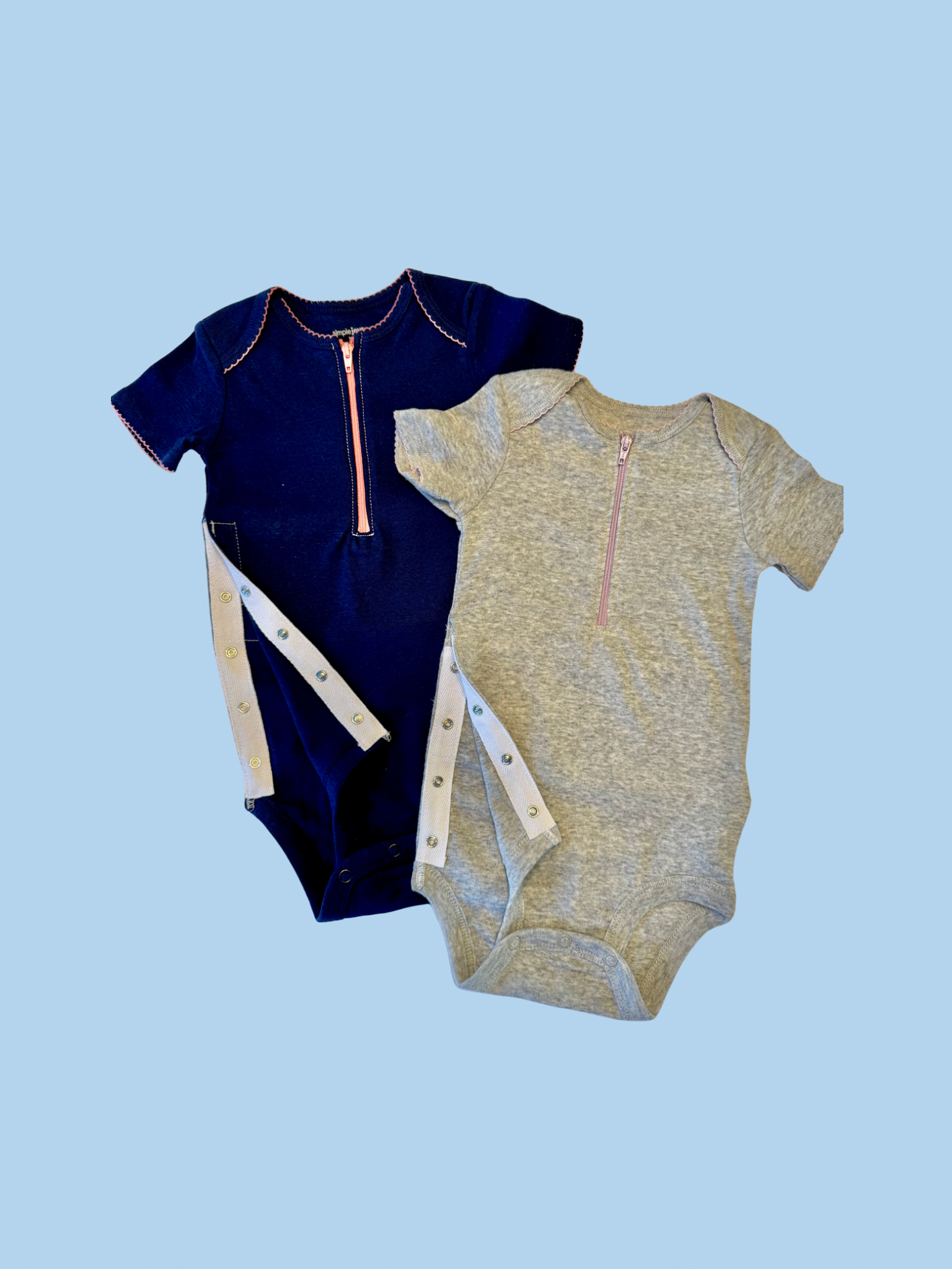 This onesie was designed to help protect central lines for babies, preventing the line from hanging out of the bottom of the onesie by keeping it securely wrapped around their backs and tucked away in a Velcro pocket. The side snaps allow the onesie to be changed with ease and without having to de-access lines while connected to IV tubing. ZipCruisers™ adapted onesies strive to lower the risk of an unnecessary infection, accidental dislodgment or unneeded surgery, while keeping your sweet baby comfortable and mobile. For babies with Mediports/Portacaths, our ZipCruisers™ provide a zippered access to the port area in addition to the ingenious support of the original Drew's Cruisers™, including side snaps and a Velcro pocket to keep lines safely tucked away.